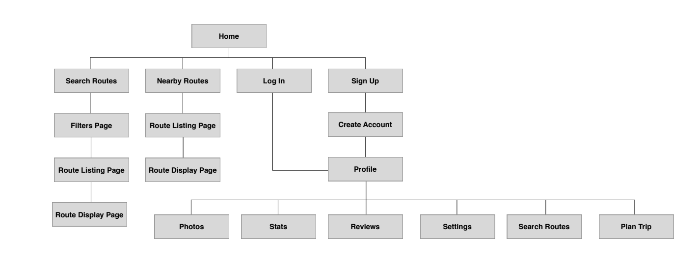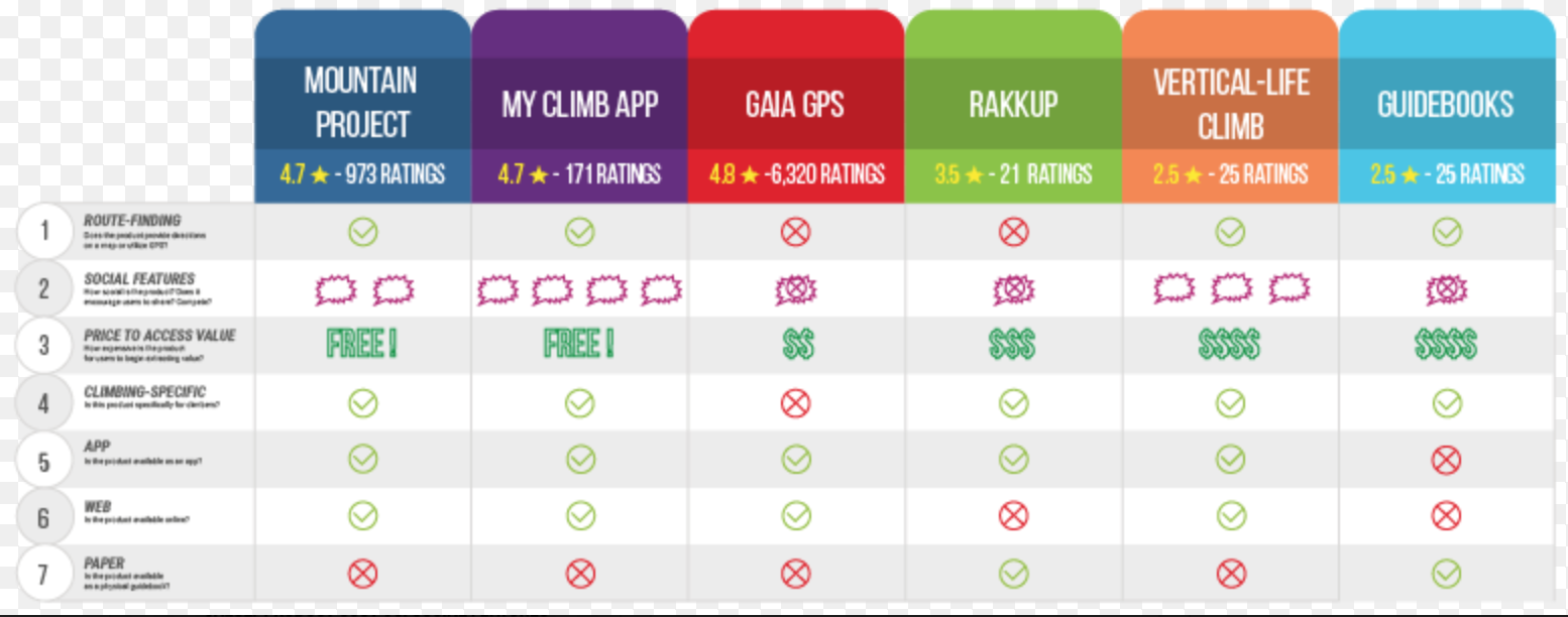 A group of relative novices to the rock climbing world, we first had to learn about the world of climbing, watching every video, reading every article, and talking to every person we could reach in order to best learn the terminology and appeals before embarking on our competitive analysis. Through the competitive analysis, we surprisingly found that books were the biggest competitor of Mountain Project, despite an array of other apps being available, as climbers treated their books like trophies as they became more marked up and dogeared, along with the fact that many climbs took place in limited reception areas, making many apps almost useless after a certain point. As far as apps, while there were several competitors, none was able to offer the range or depth of Mountain Project.