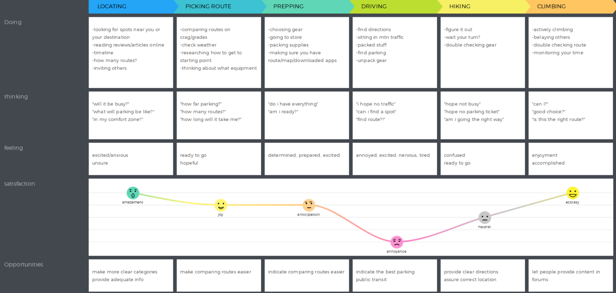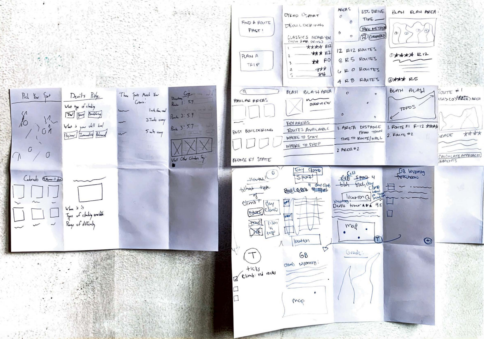 After sketching and ideation, we developed a more precise understanding of the user experience, mapping out potential navigation paths within the app. this included creating a comprehensive journey map that illustrated the full process climbers undergo when preparing for a climb, seamlessly integrating the app into their workflow for a more intuitive and cohesive experience. The journey map also revealed key opportunities for enhancing Mountain Project, such as integrating features to highlight optimal parking locations near climbing routes and identifying accessible public transportation options for improved trip planning.