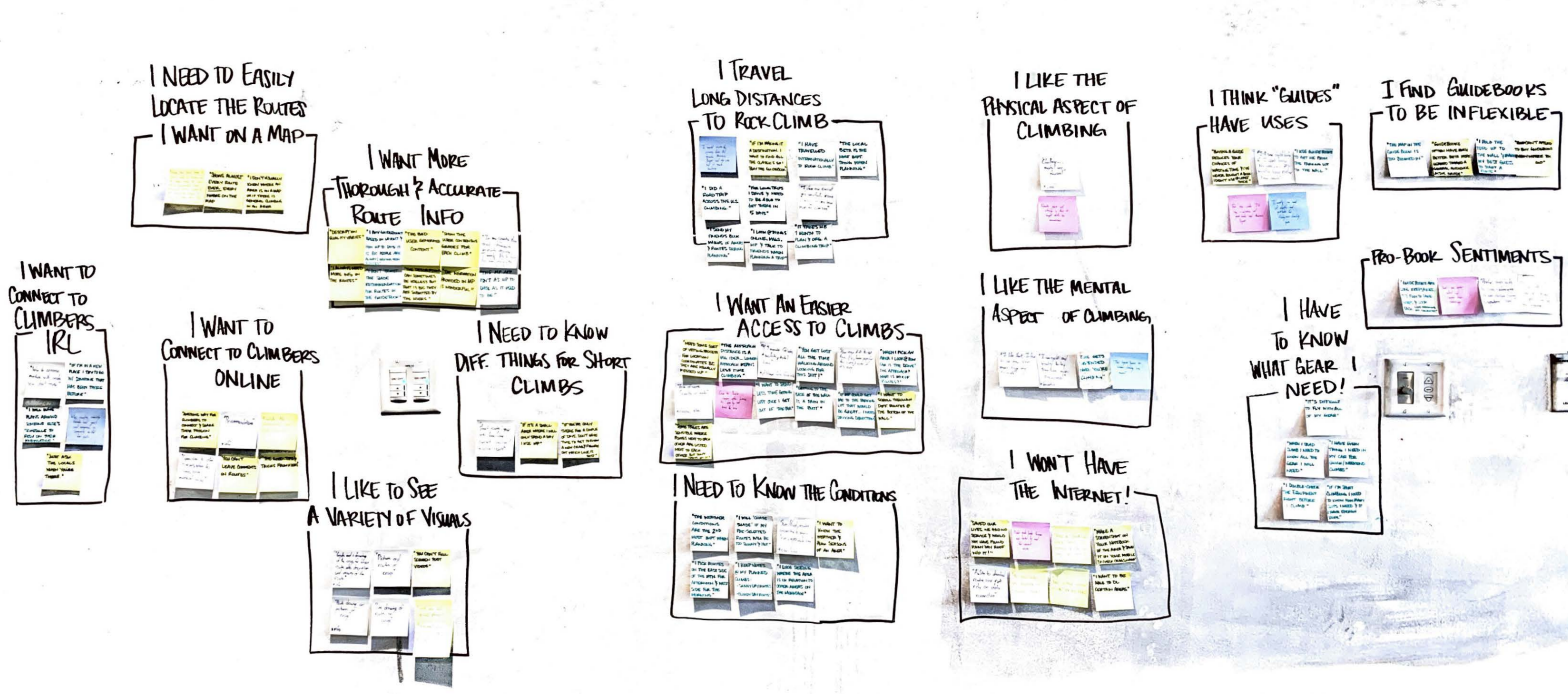 For our user research, we used a mix of surveys, interviews, contextual inquiry, and reading of reviews, followed by extensive affinity mapping in order to try to find commonalities that we might have previously missed. By posting a Google Docs survey in several rock climbing groups on Facebook, we were able to reach 36 different people, including 32 Facebook survey respondents, of which 6 subsequently gave their emails for more in depth questioning. We also were able to interview 4 people in person. Our respondents emphasized the role of rock climbing as community, the need for quick and nearby climbing information, and the number of sources they often had to consult to plan their climbs.